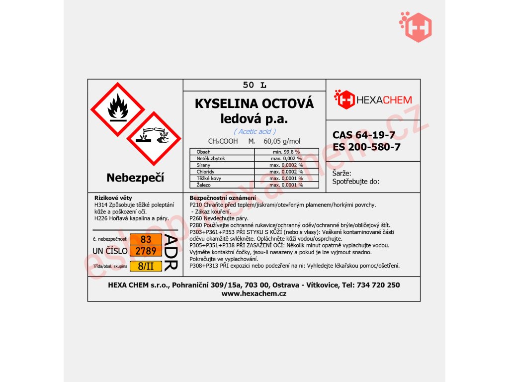 | Transport (ADR) | UN 2789, Kyselina octová, ledová, 8(3), II (D/E) Přepr. kat.: 2, Ohrožující živ. prostředí : ne Klasif. kód: CF1 |