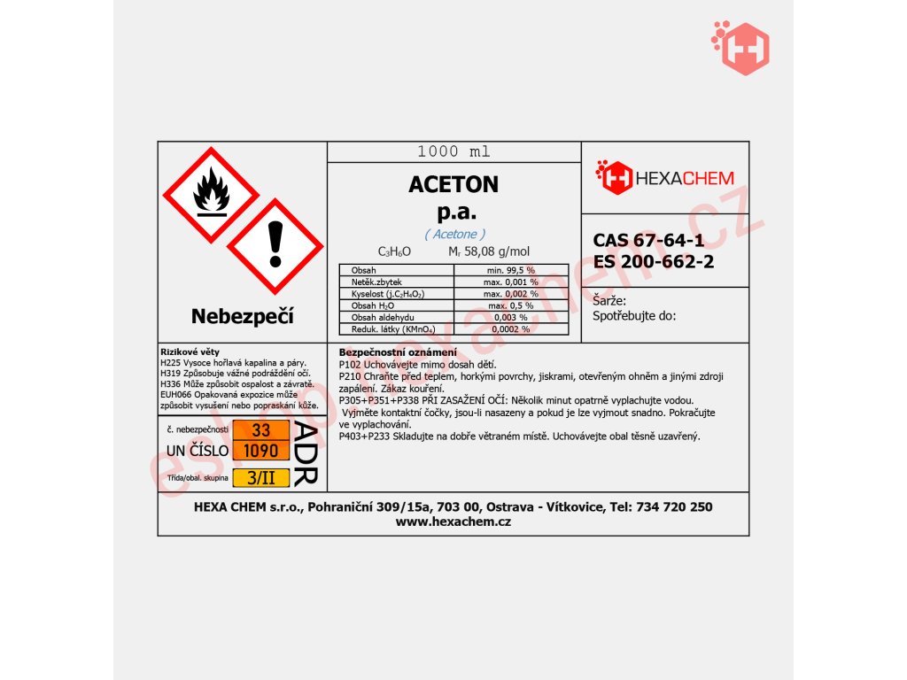 Aceton o czystości laboratoryjnej cz.d.a. (Pro Analysi) to bezbarwna, silnie lotna ciecz o charakterystycznym aromatycznym zapachu. Jest to najprostszy keton, który dzięki swojej wysokiej czystości odparowuje całkowicie bez pozostawiania osadu. Jest jednym z najskuteczniejszych rozpuszczalników substancji organicznych.