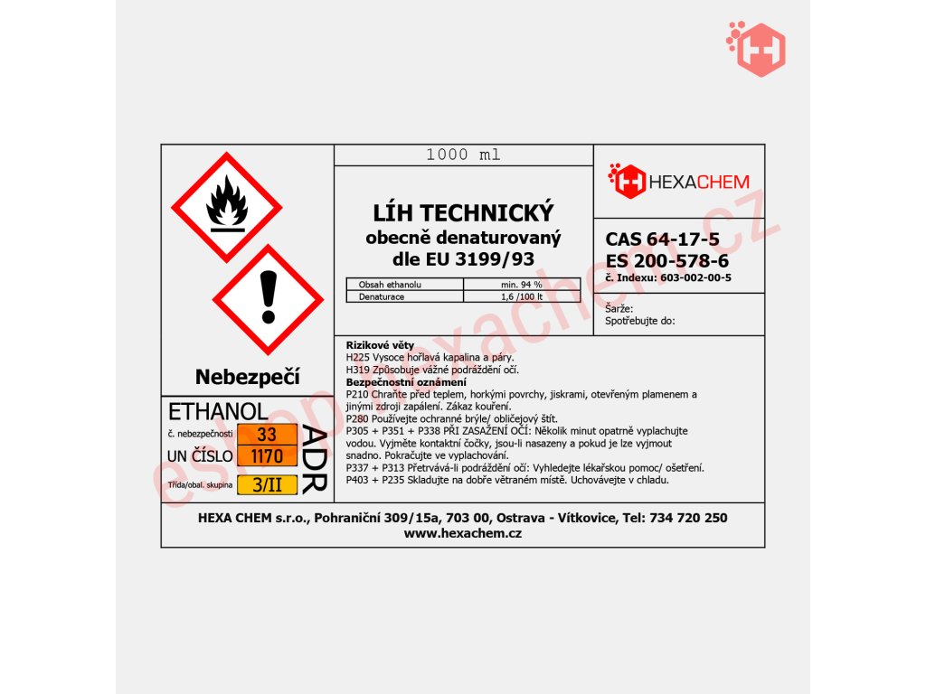 | Transport (ADR) | UN 1170, ETANOL (ALKOHOL ETYLOWY), 3, II, (D/E) Kat. transp.: 2, Zagrożenie dla środowiska: nie Kod klas.: F1 |