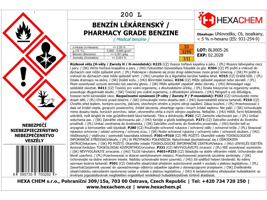Benzyna apteczna (czysta benzyna techniczna) to wysoce rafinowany lekki destylat ropy naftowej. Jest to przezroczysta, bezbarwna ciecz o charakterystycznym zapachu, która charakteryzuje się wyjątkową czystością i wąskim zakresem temperatury wrzenia. W przeciwieństwie do zwykłych rozpuszczalników nie zawiera domieszek olejowych, dlatego po aplikacji odparowuje bez reszty. Produkt ten charakteryzuje się ekstremalną czystością (zawartość aromatów i benzenu poniżej 0,001 %), dzięki czemu idealnie nadaje się do najbardziej wymagającego odtłuszczania i celów laboratoryjnych.