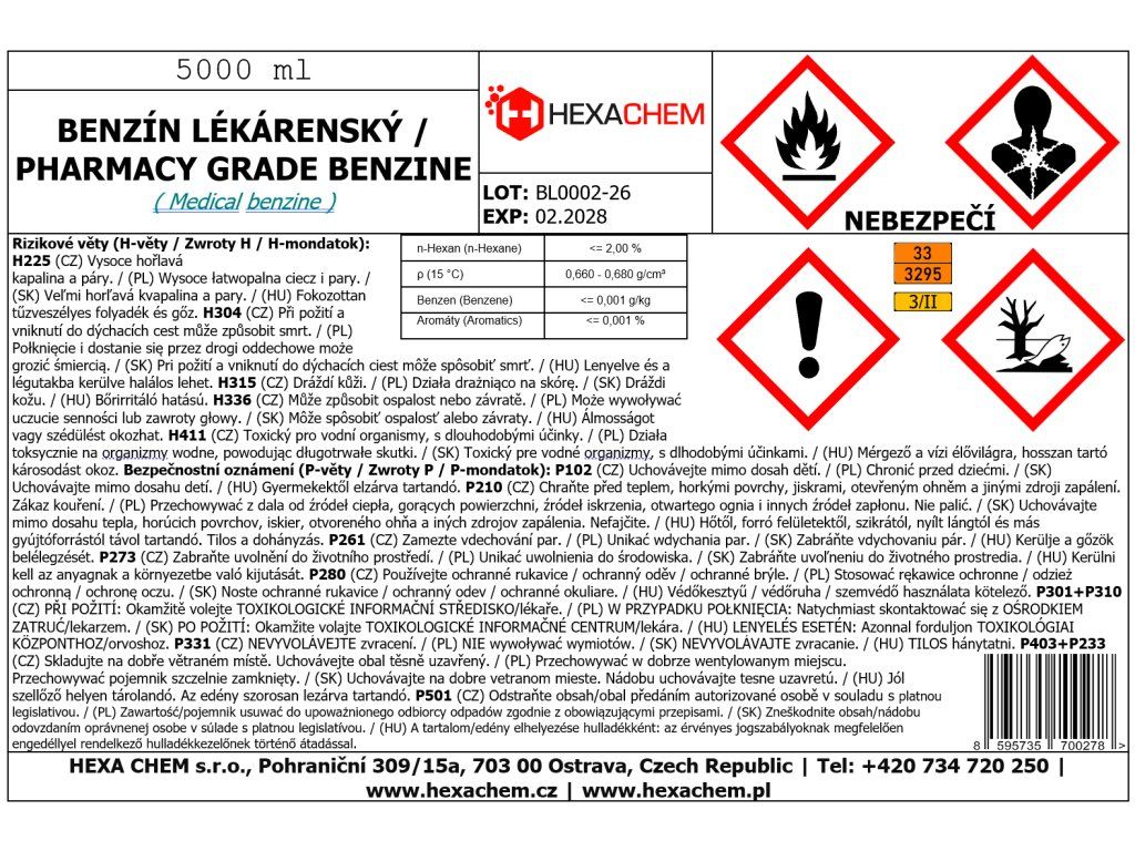 Benzyna apteczna (czysta benzyna techniczna) to wysoce rafinowany lekki destylat ropy naftowej. Jest to przezroczysta, bezbarwna ciecz o charakterystycznym zapachu, która charakteryzuje się wyjątkową czystością i wąskim zakresem temperatury wrzenia. W przeciwieństwie do zwykłych rozpuszczalników nie zawiera domieszek olejowych, dlatego po aplikacji odparowuje bez reszty. Produkt ten charakteryzuje się ekstremalną czystością (zawartość aromatów i benzenu poniżej 0,001 %), dzięki czemu idealnie nadaje się do najbardziej wymagającego odtłuszczania i celów laboratoryjnych.